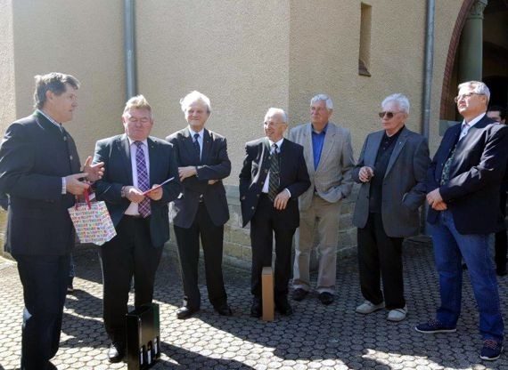 Wie es sich für den Jubilar, einem Nebenerwerbsweinbauern geziemt, erhielt dieser neben einem Reisegutschein für Georg und seine Rosa gute Weine und von Vikariatskassier Otmar Fuhrmann einen prächtigen „Tupfer“, für Sprachunkundige = Weinheber.