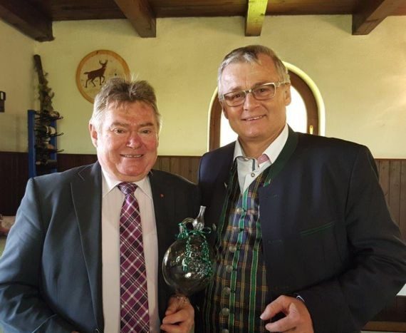 Otmar Fuhrmann überreicht einen „Tupfa“ an Georg Hofmeister