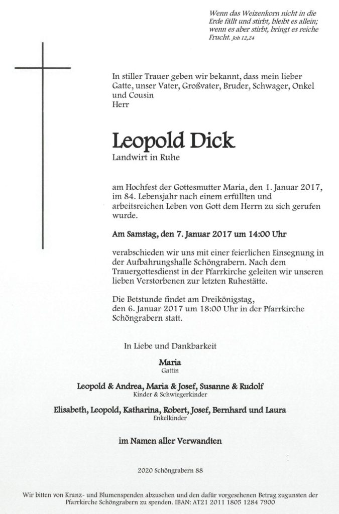 Leopold Dick war Landwirt und Gründungsmitglied der KMB in Schöngrabern im Jahre 1961, also 55 Jahre aktiv, von 1994 bis 2003 Obmann der Pfarrgruppe und Träger des silbernen Ehrenzeichens der KMB. Er baute die Pfarrgruppe sehr umsichtig auf und unter seiner Führung wurde beim Graberner Advent der Stand der KMB für die Aktion “Bruder in Not – Sei so frei” ins Leben gerufen.